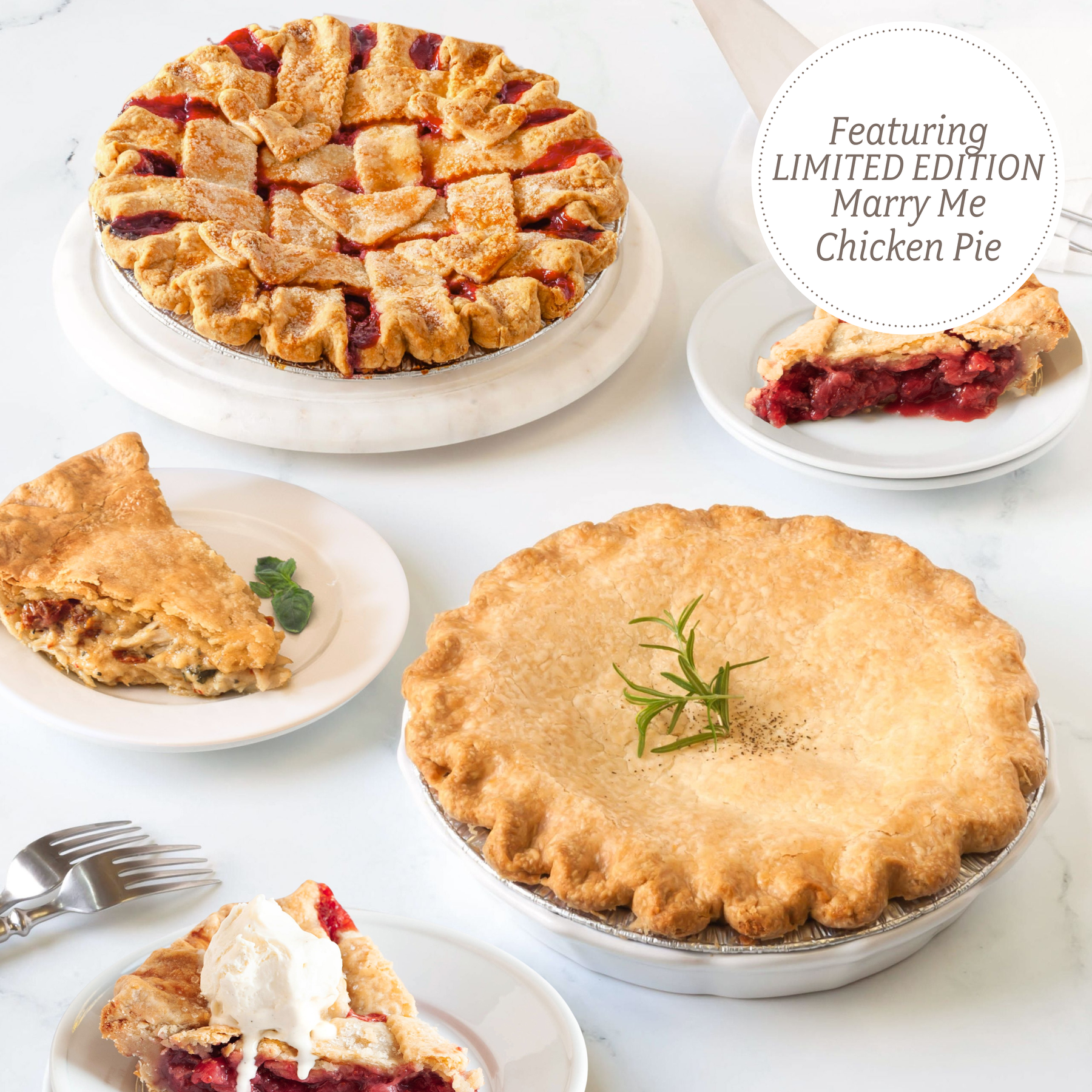 Our Valentine’s Dinner and Dessert Box is a complete, cozy celebration in one beautiful package. It features our fan-favorite Marry Me Chicken dinner pie, rich, comforting, and made to feel like a true special occasion, paired with your choice of one of our classic dessert pies. It is everything you need for an effortless, romantic night in, a thoughtful gift, or a warm way to say “I love you.”